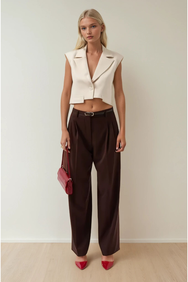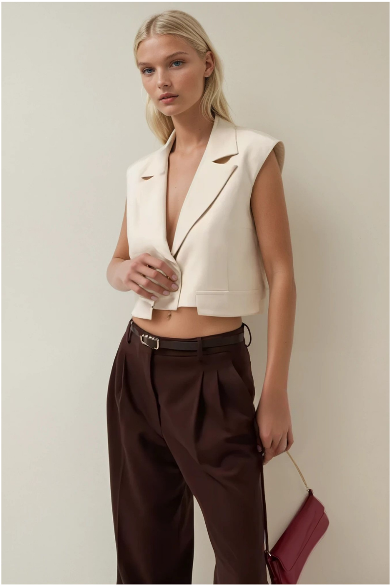 Bej düğmeli zarif crop yelek, minimal tasarımı ve modern kesimiyle şehirli stilin vazgeçilmez parçasıdır. Zarif düğme detayları sayesinde klasik ve şık bir görünüm sunarken, crop boyu ile trend bir siluet oluşturur. Günlük kombinlerden ofis şıklığına kadar geniş kullanım alanı sağlar.