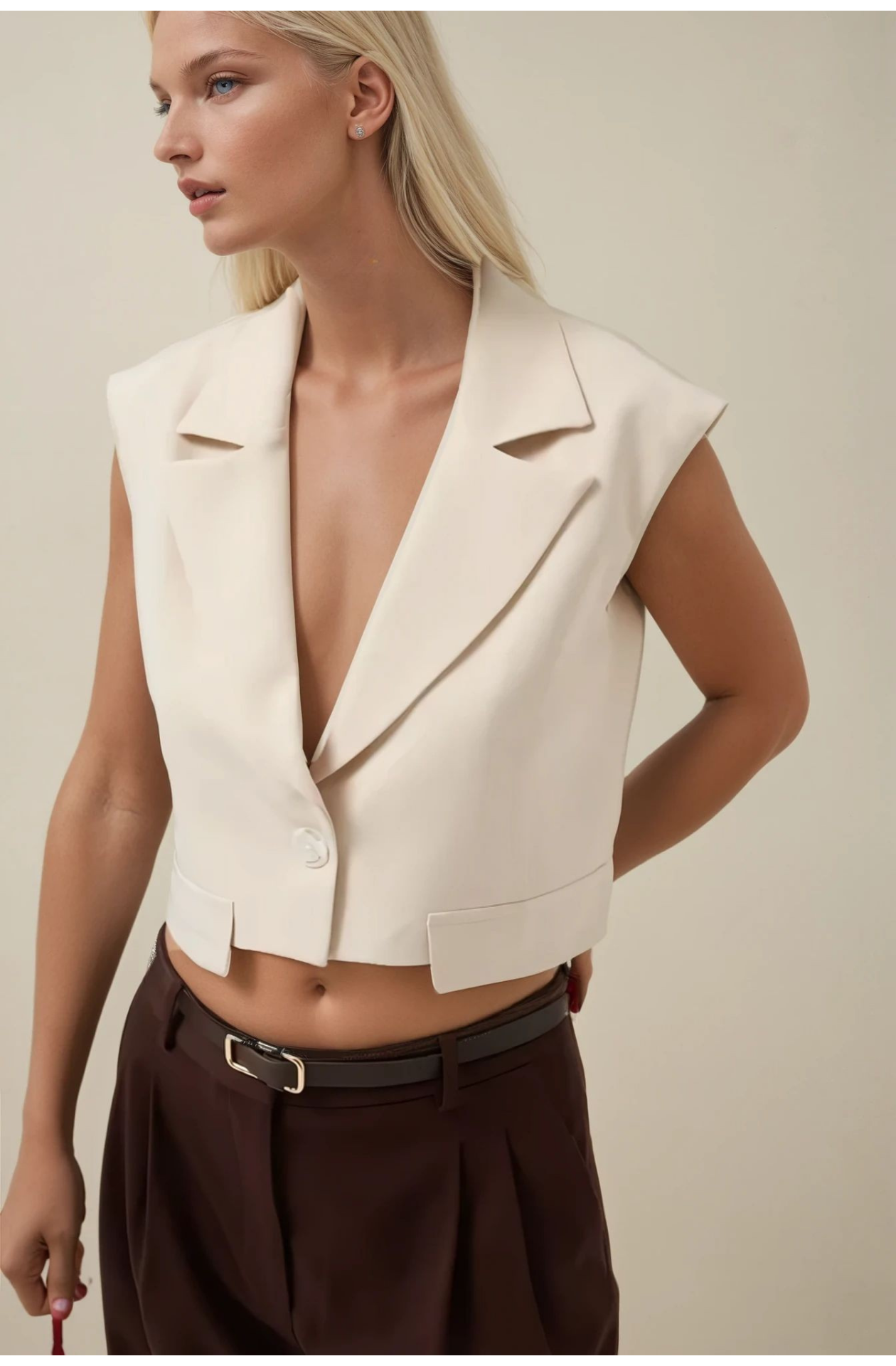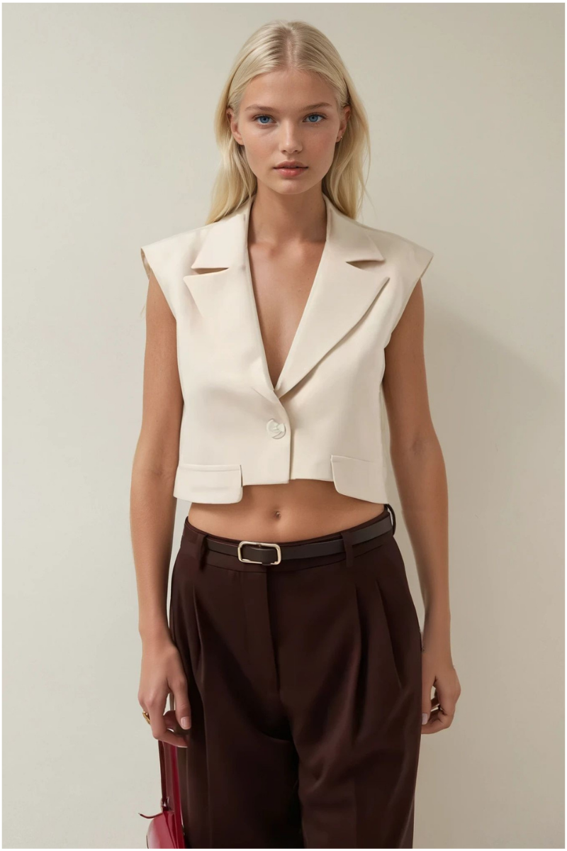 Bej Düğmeli Zarif Crop Yelek