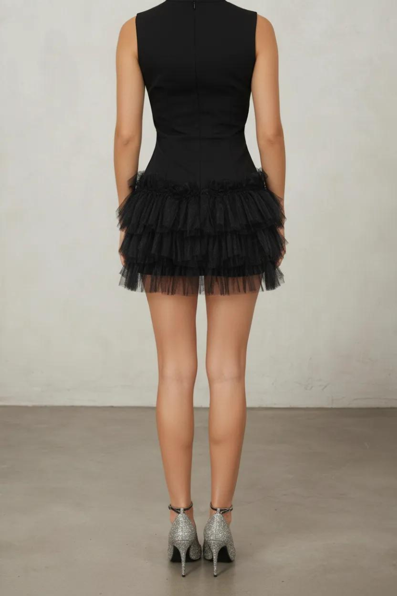 Tül Etekli, Siyah, Kolsuz Mini Elbise | Şıklığın ve Zerafetin Modern Bir Yorumu