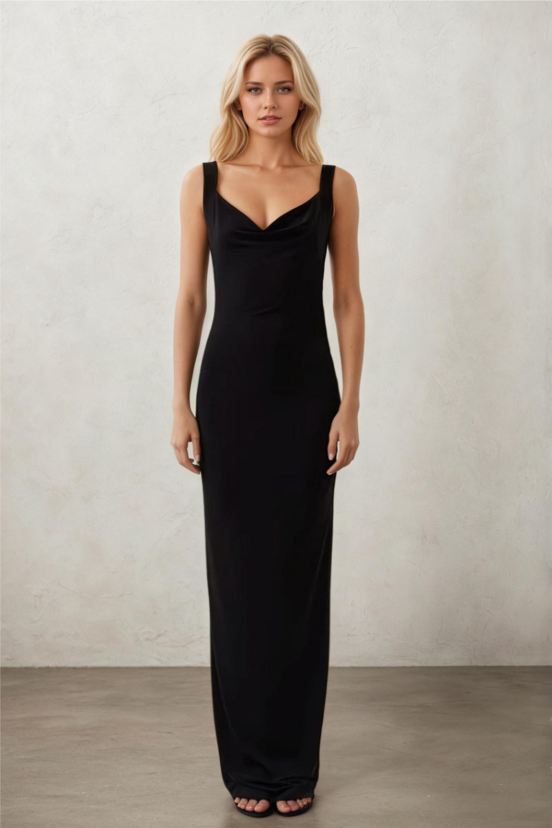 Zamansız şıklığıyla dolabınızın vazgeçilmez bir parçası olacak siyah sırt dekolteli maxi elbiseyle, her adımınızda etkileyici ve kendinden emin hissedin.